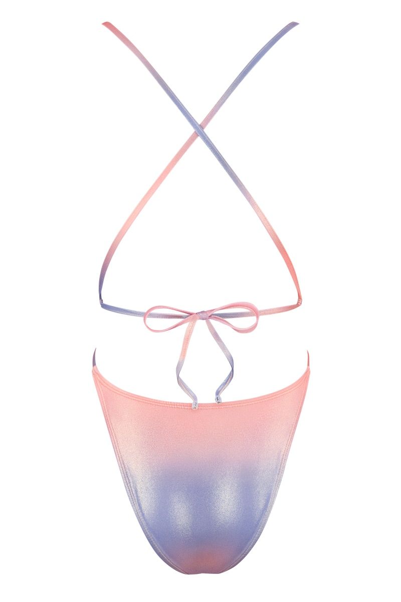 Практически превращение в экзотическую русалку. Купальник из сияющего материала с металлическим блеском. Эффект мокрой блестящей ткани. Оттенки перетекают один в другой – потрясающий внешний вид. Низ – с максимально высокими вырезами на бедрах. Мода на 90-е годы сейчас – на пике актуальности. Сексуальный и женственный стиль с завязками: вокруг талии. Спина – открытая, с перекрестными лямками. Декольте – глубокое. Всё подчеркивает красоту фигуры и пленительные формы.