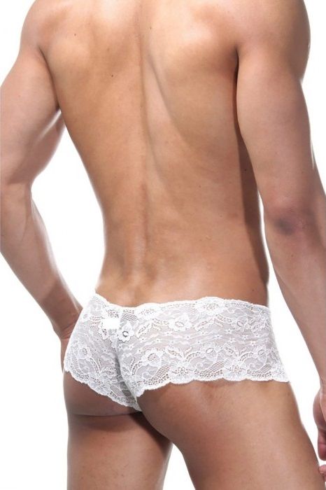 Кружевные светлые трусы-хипсы с низкой посадкой для мужчин. Спереди черная эластичная плотная вставка.