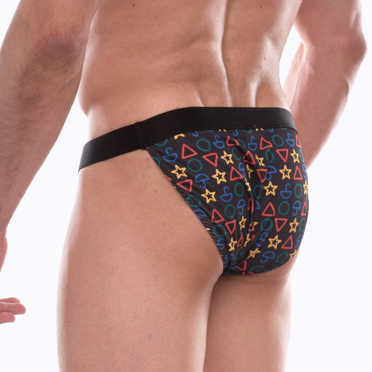 Темно-серые трусы-танга с разноцветным принтом в виде значков.