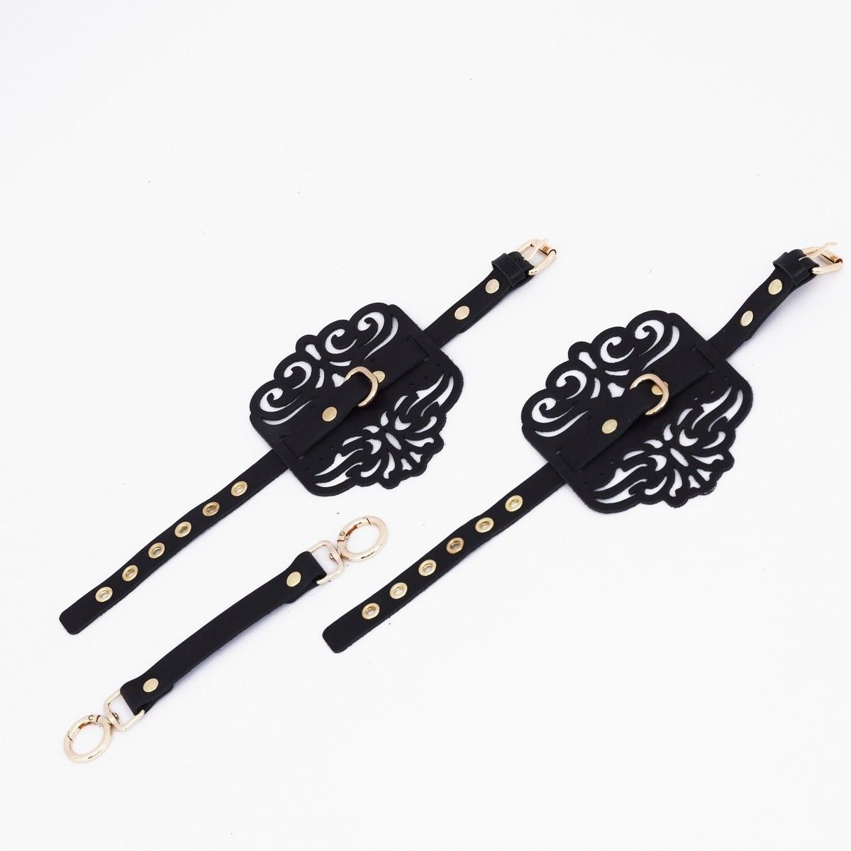 Оковы фигурные из натуральной кожи, украшенные узорами. Каждый элемент дизайна тщательно проработан, чтобы подчеркнуть красоту и элегантность изделия. Золотистая фурнитура, сверкающая на фоне черной кожи, добавляет утонченности и изысканности. Полукольцо, расположенное посередине, предоставляет дополнительные возможности для фиксации рук с помощью соединительного элемента с двумя карабинами, который идет в комплекте. Доставляется в фирменной упаковке в виде брендированной деревянной подложки.Характеристики
