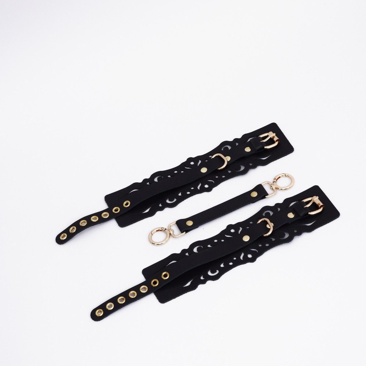 Оковы с узорным дизайном из натуральной кожи с золотой фурнитурой. Резные элементы придают атмосферу нежности, элегантности и подчеркивают красоту тела. Регулируются ремешком, а также в комплекте прочный соединитель с двумя карабинами. Доставляется в фирменной упаковке в виде брендированной деревянной подложки. Длина манжеты - 25,5 см. Ширина манжеты - 7 см. Обхват - 24-33 см.Характеристики
