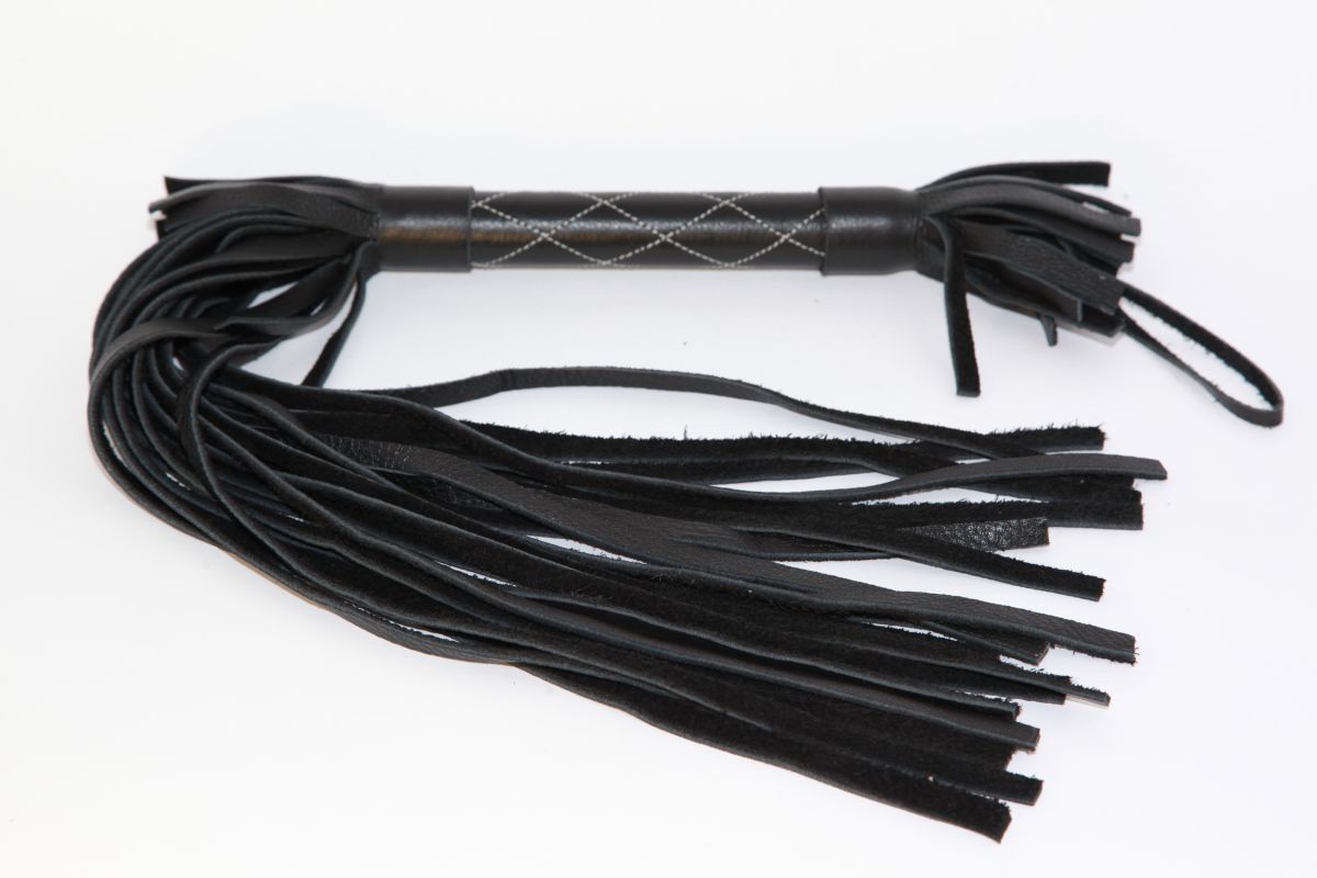 Аккуратная черная плетка, изготовленная из натуральной кожи. Имеет жесткую ручку, также покрытую кожей и украшенную белыми простроченными нитями. Имеется петля для удобного использования плети. Длина рукояти - 17 см. Длина хлыстов - 27 см.