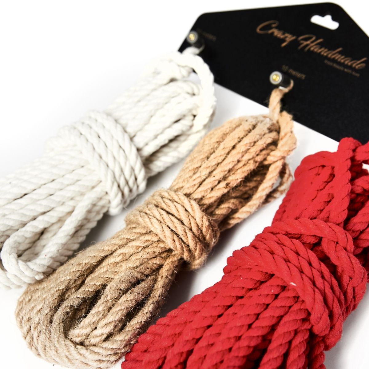 Набор из 3 разноцветных веревок для шибари (белая и красная из хлопка, коричневая из джута).