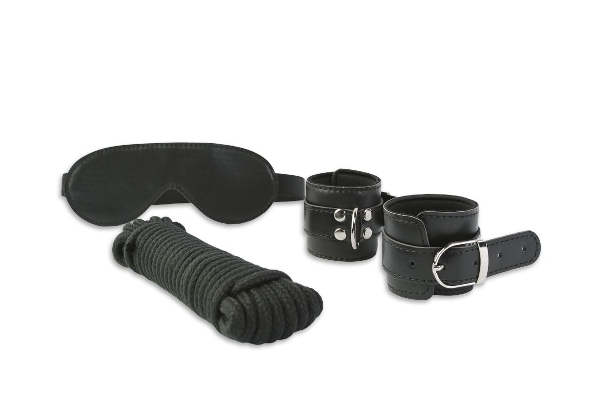 Старт-набор для тех, кто хочет начать «карьеру БДСМ»! универсальная атрибутика, без которой не обойдется ни одна ролевая игра – 2 пары манжет, закрытая маска на глаза и верёвка для связывания. Маска и манжеты выполнены из качественного кожзаменителя. Манжеты могут использоваться в качестве наручников и фиксаторов для ног, к ним стоит всего лишь привязать верёвку. Чтобы обострить ощущения и сделать каждое движение партнера для себя сюрпризом, наденьте маску. Длина верёвки - 900 см. Длина наручников - 28 см. Максимальный обхват - 25 см.