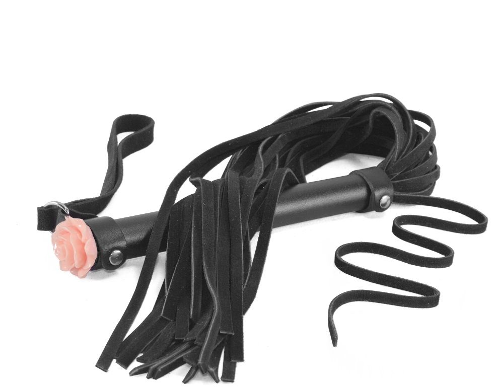 Плеть изготовлена из натуральной велюровой кожи. Цвет черный. Торец металлической рукояти украшена акриловой розой. Количество лент в хвосте 25-26. Длина рукояти - 17 см.