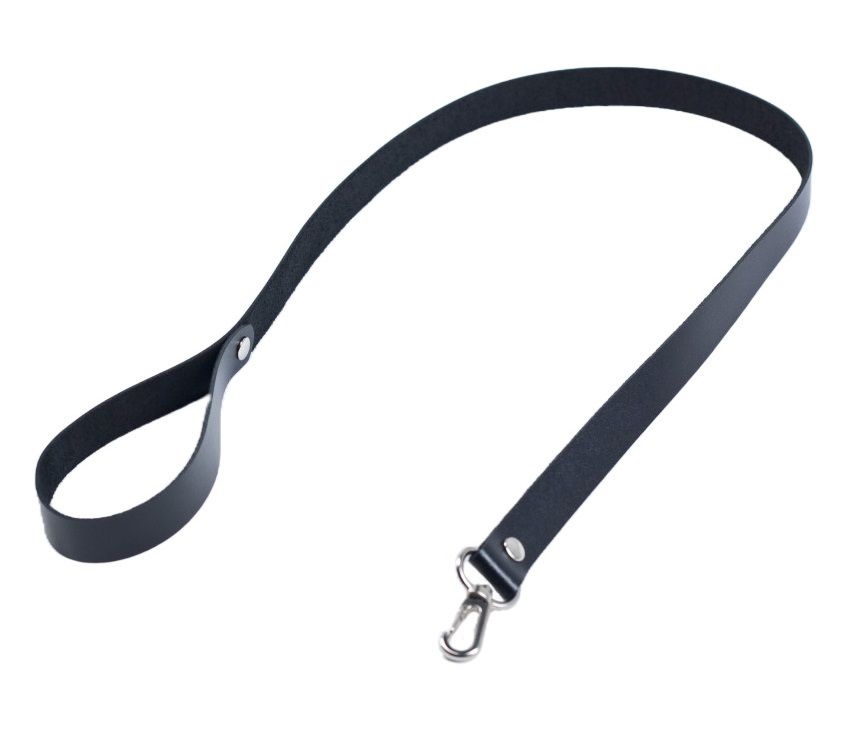 Базовая версия поводка с карабином. Особенности: - черная натуральная кожа (1.8-2 мм) - длина 85+/-5 см - никелированная металлическая фурнитура - удобная петля для руки. Ошейник не входит в комплект!